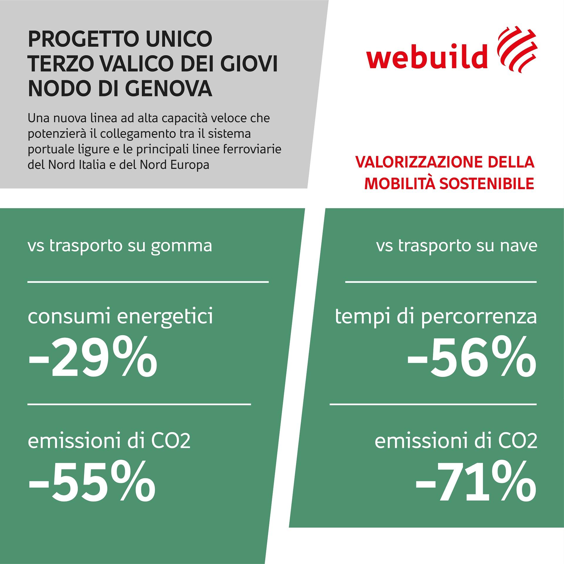 Il Terzo Valico non solo contribuisce a una significativa riduzione dei consumi energetici e delle emissioni di Co2, grazie allo spostamento del trasporto da gomma a rotaia e muovendo le merci lungo la linea ferroviaria. Rispetto al tradizionale trasporto su gomma, il Progetto Unico Terzo Valico dei Giovi - Nodo di Genova permetterà di abbattere del 29% i consumi energetici e del 55% le emissioni di Co2 nell’atmosfera; mentre nei confronti del trasporto su nave i tempi di percorrenza si abbatteranno del 56% e del 71% saranno ridotte le emissioni di anidride carbonica.